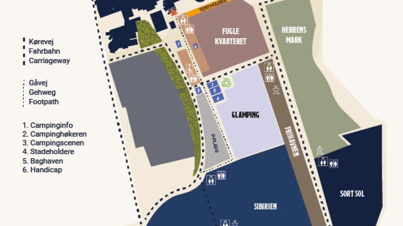 Campingområdet er opdelt i 8 kvarterer – alle med deres egen stemning og placering. Derudover har vi to eksterne campingområder på Industrien og ved Tønderhallerne. Læs mere om områderne nedenfor.