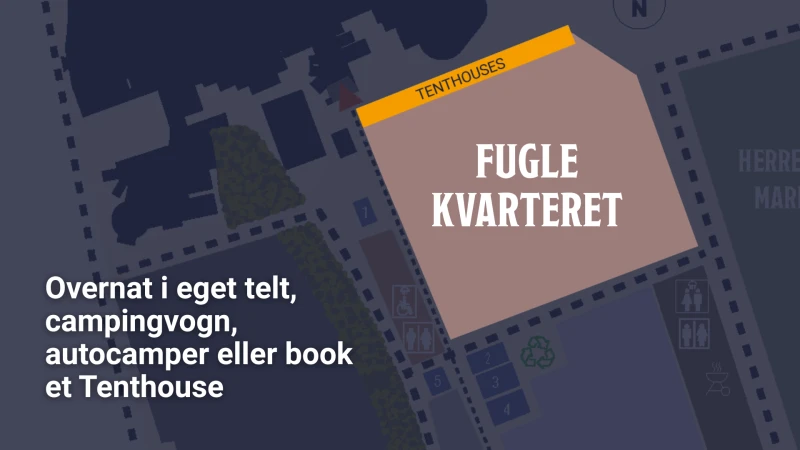 Fuglekvarteret ligger tættest på festivalpladsen og midt i livet. Her kan du vælge plads med eller uden strøm, og Telthouses står klar, hvis du vil slippe for opsætning. Området summer af glade gæster og livemusik fra Campingscenen – perfekt, hvis du vil være midt i festivalstemningen.