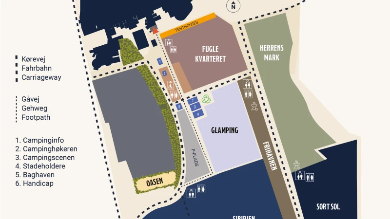 Se kort over campingområdet herunder*. Klik på kortet for at åbne i fuld størrelse.