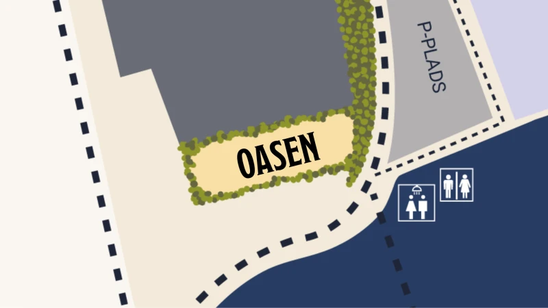 Skabt som et hyggeligt samlingspunkt midt på pladsen, er der i Oasen fokus på nærvær, fællesskab og små pauser mellem koncerterne. Oasen er for dig, der gerne vil være tæt på festivalens liv, men stadig have et sted, hvor stemningen er afslappet og indbydende.